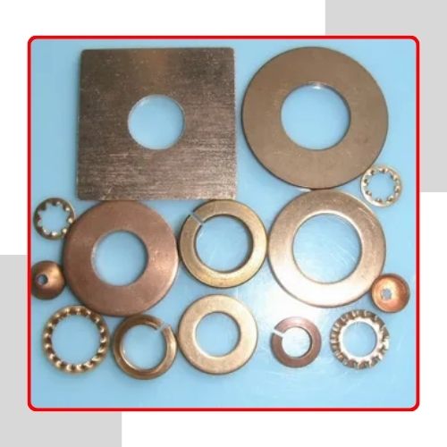 Phosphorous Bronze Washers consist of copper (88–90%), tin (8–10%), and phosphorus (up to 0.35%). The alloy provides tensile strength of 300–600 MPa and yield strength up to 300 MPa, along with good fatigue strength and Brinell hardness between 90–130. These washers hold their properties at varying temperatures and resist corrosion from seawater, acidic chemicals, and lubricants. Phosphor bronze also offers great anti-friction properties, wear resistance, and dimensional stability. These qualities make the washers effective in applications involving frequent motion, vibration, or conductive contact surfaces.